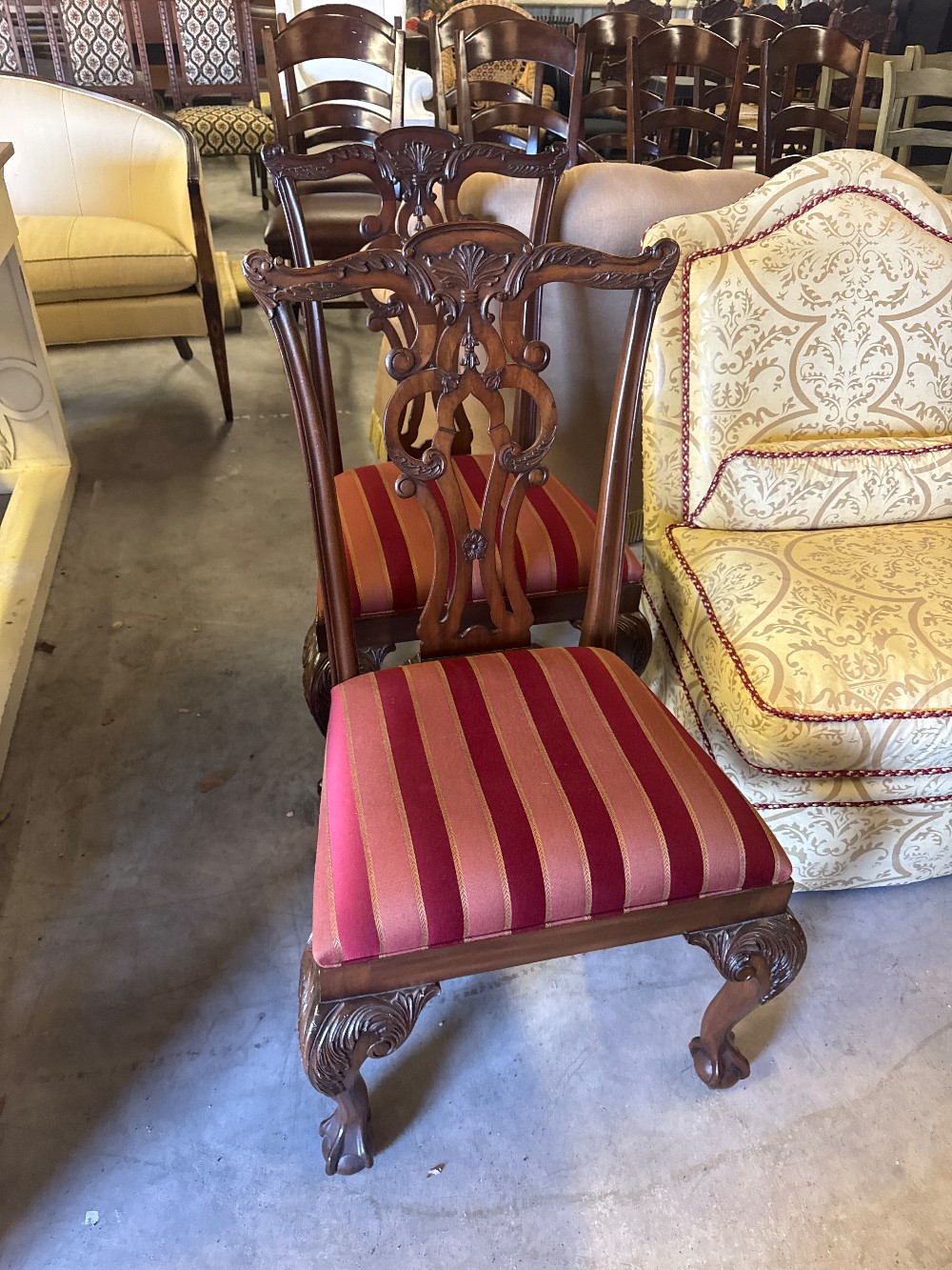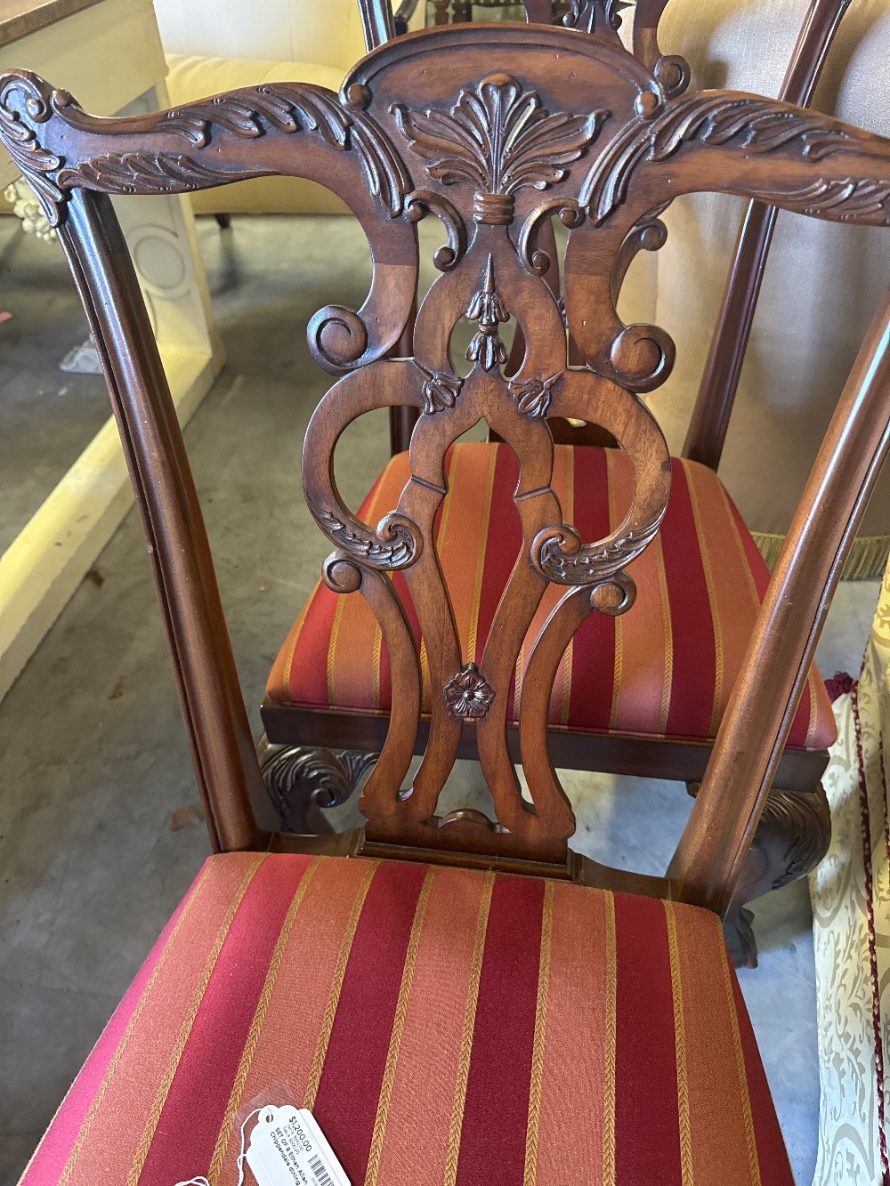 Set of 8 arm-less dining chairs in excellent used condition. Still available through Ethan Allen retail: approx. $900 per chair